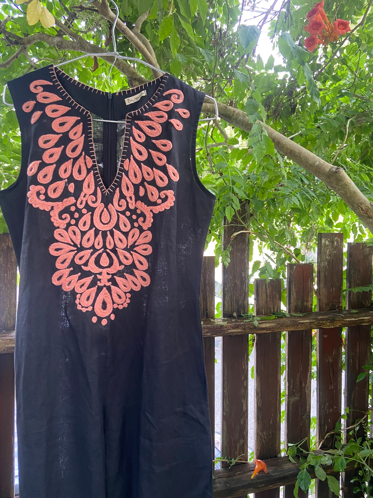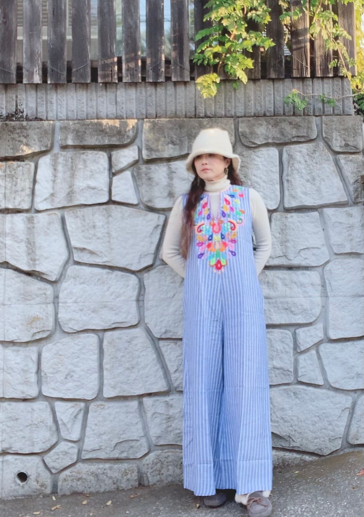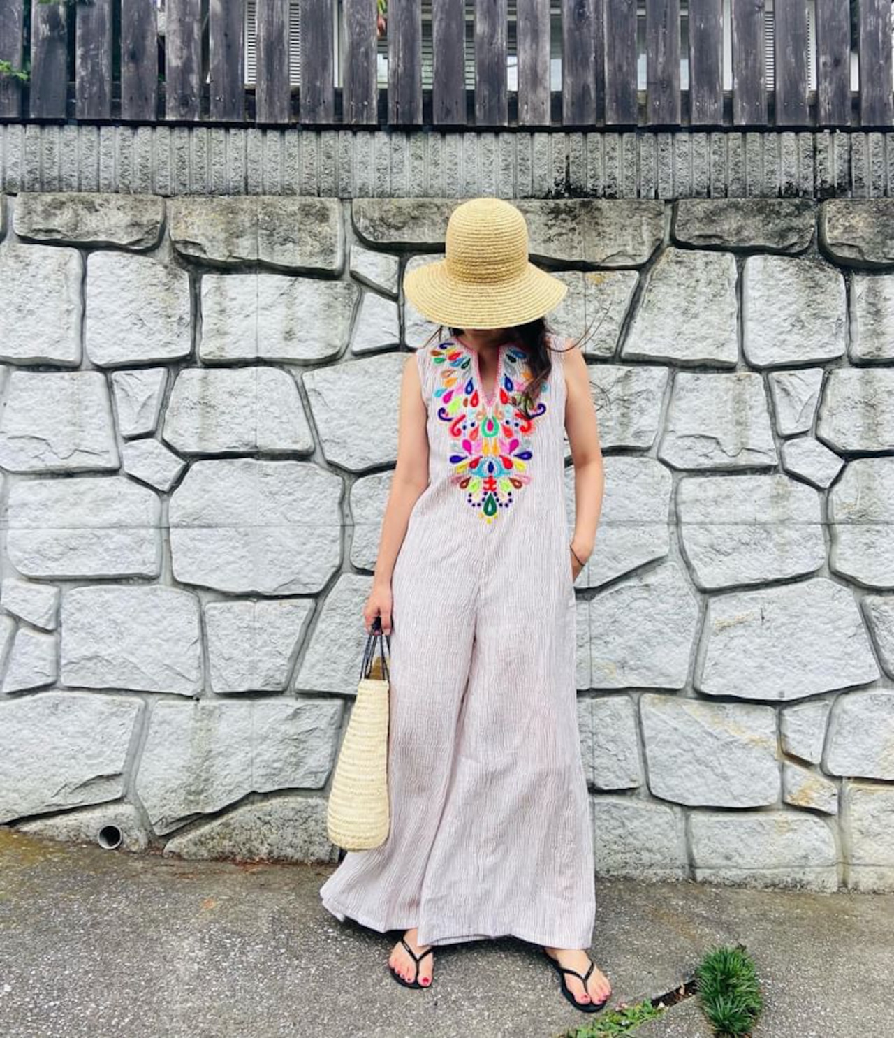 胸刺繍が可愛い大人気オールインワンがオンラインでも登場しました!Vネックがスッキリとしたデザインで、胸元を美しく演出します。キャミソールなどのインナーを合わせてもスッキリと着られるので、自信を持って着ていただけます。