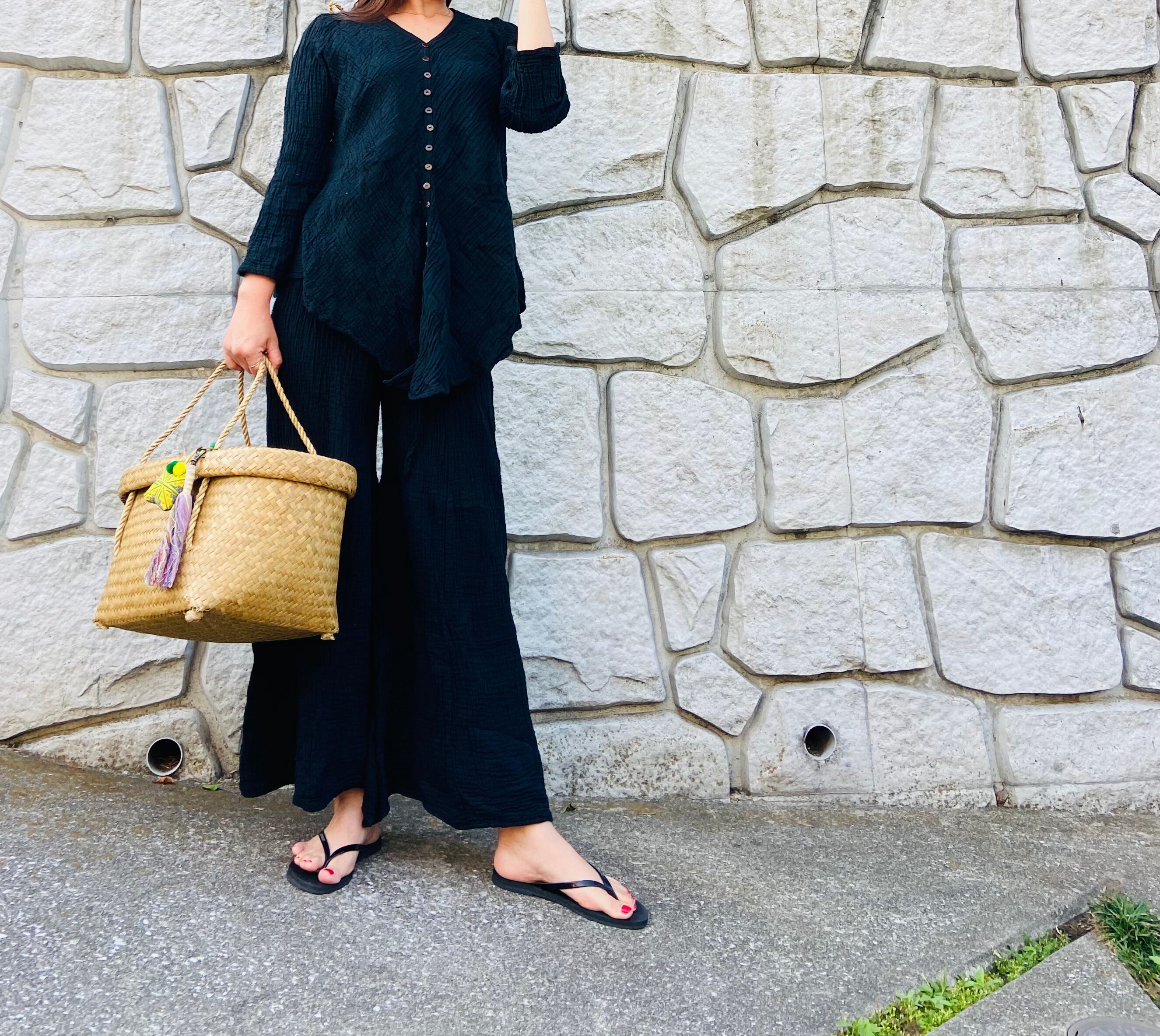 色落ちはほとんどないですが、リンクル素材なのでネットに入れてお洗濯して下さい。たたまず、ぐるっぐるっとネジっておくとまたシワがでてきます^_^
