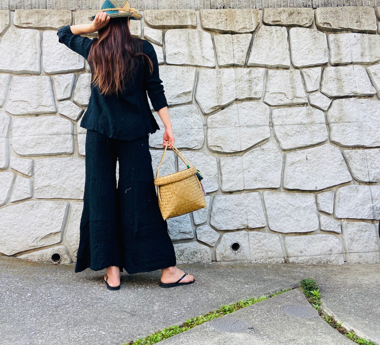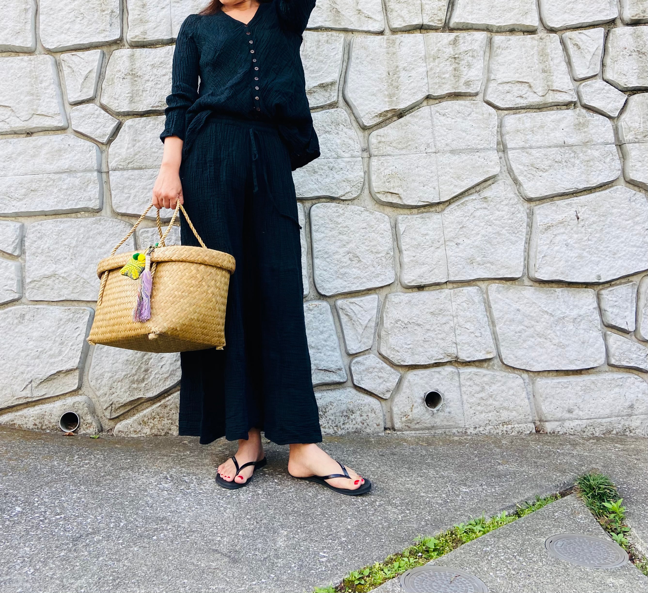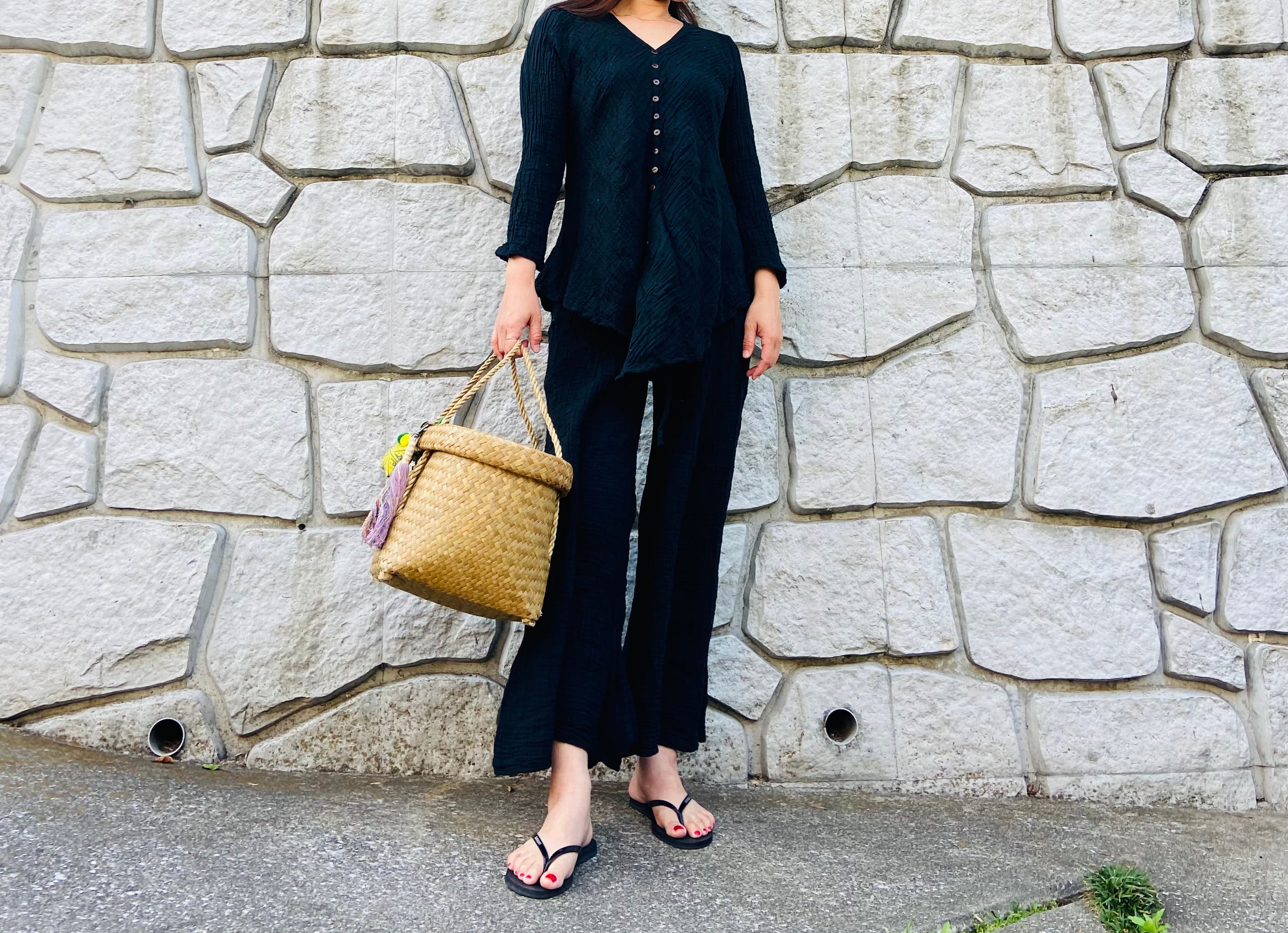 同素材のワイドパンツとセットアップにスタイリングすると特別感が出て素敵です!