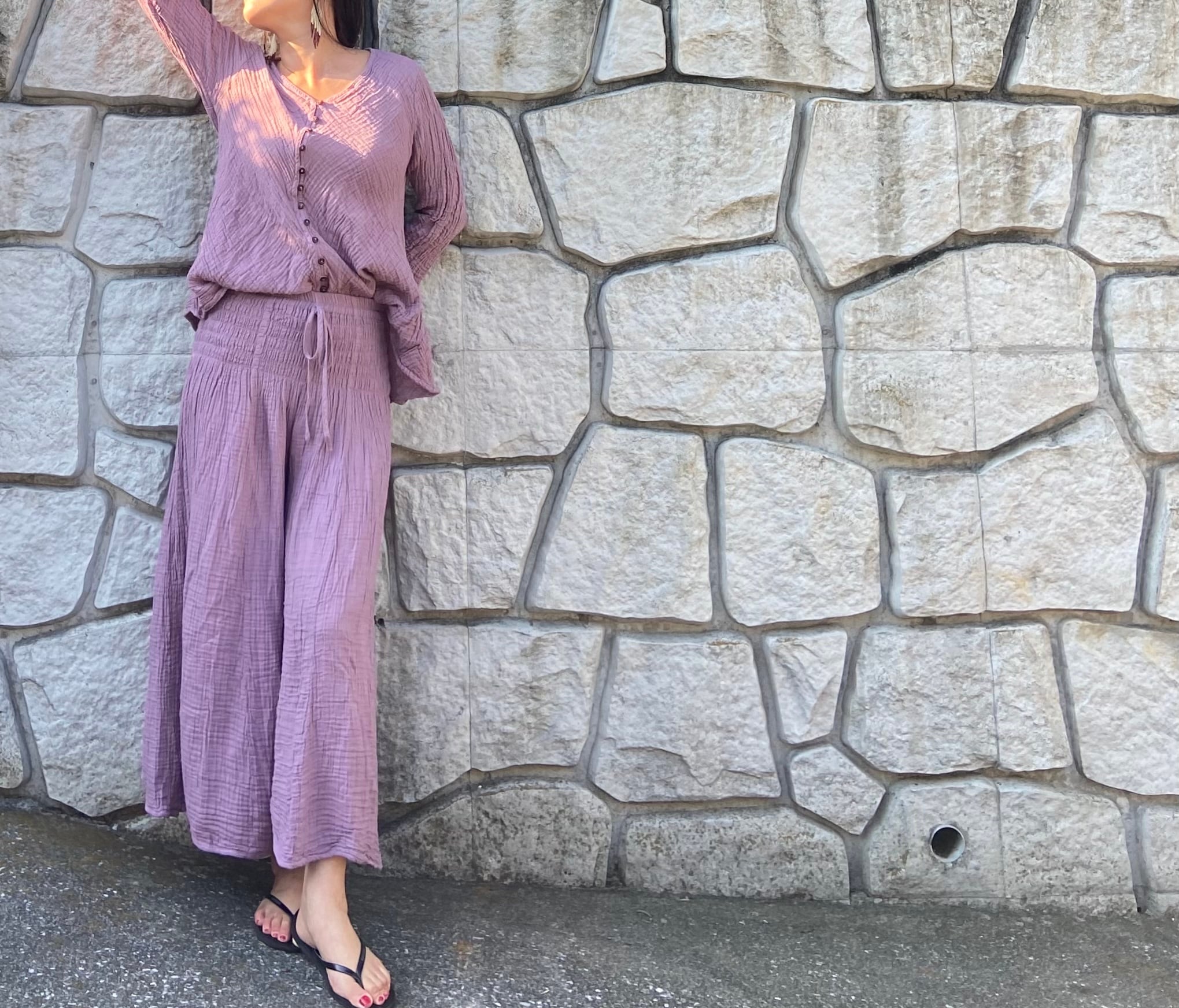 ダブルガーゼ Vネックボタントップス(長袖)