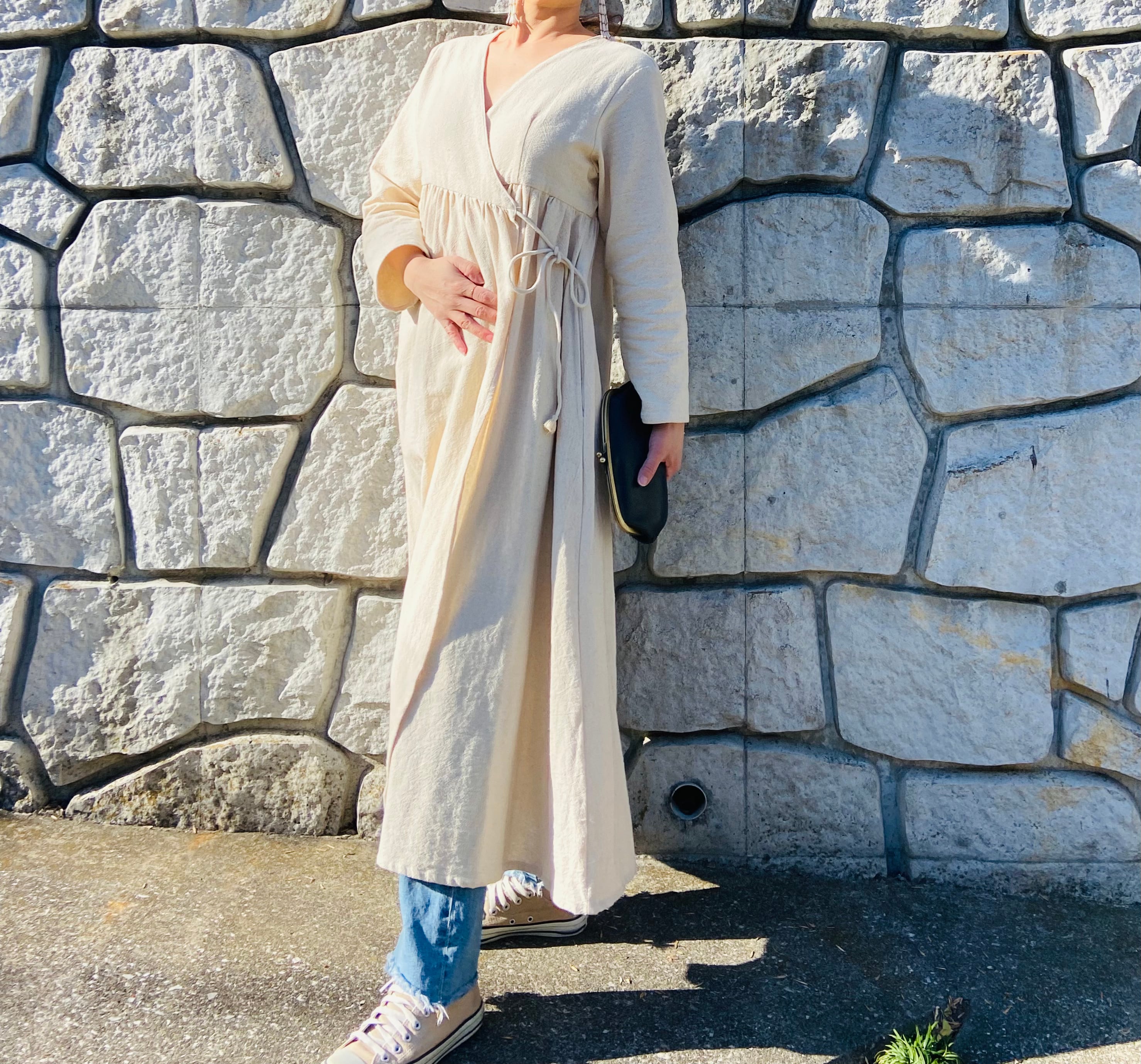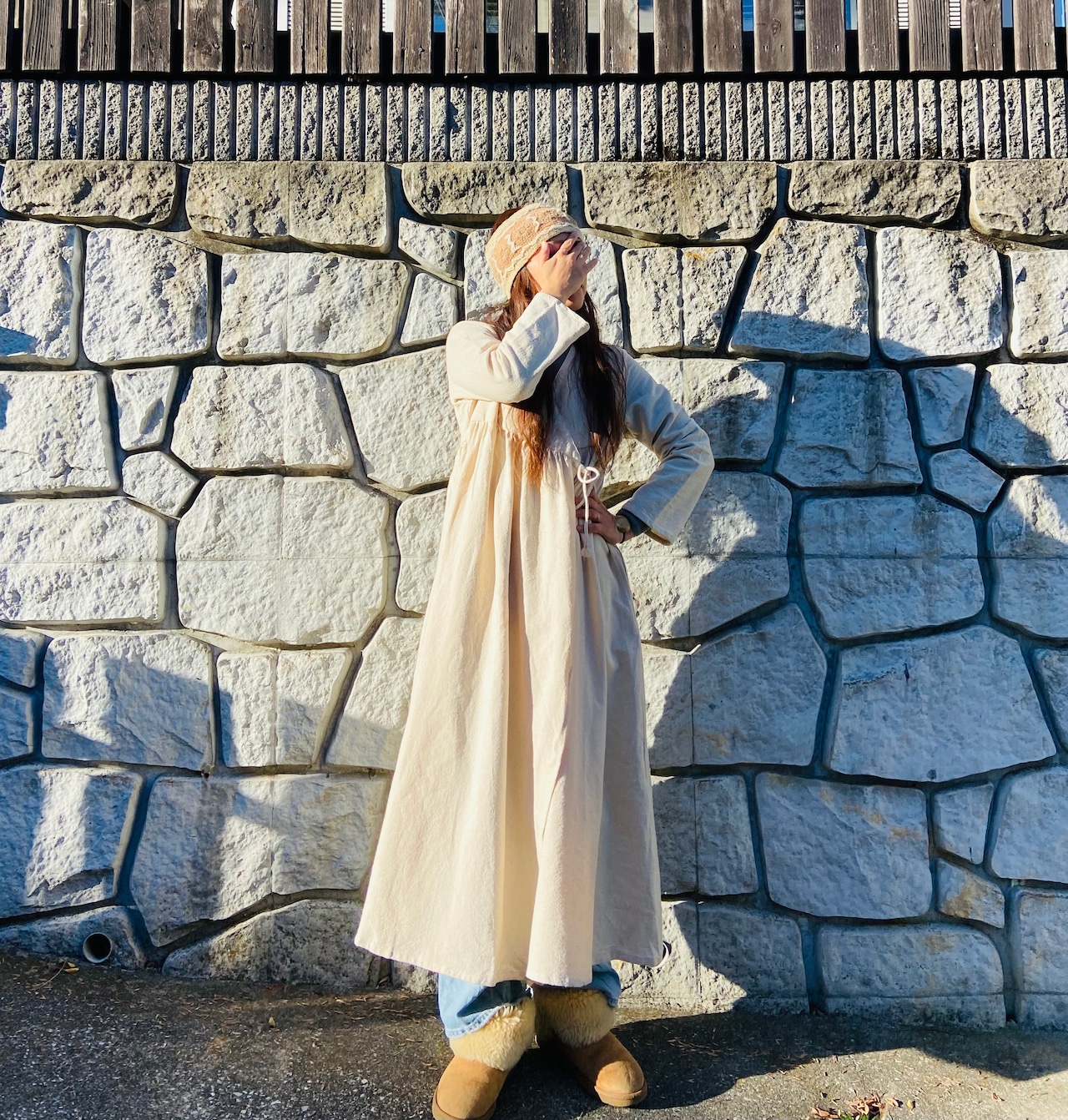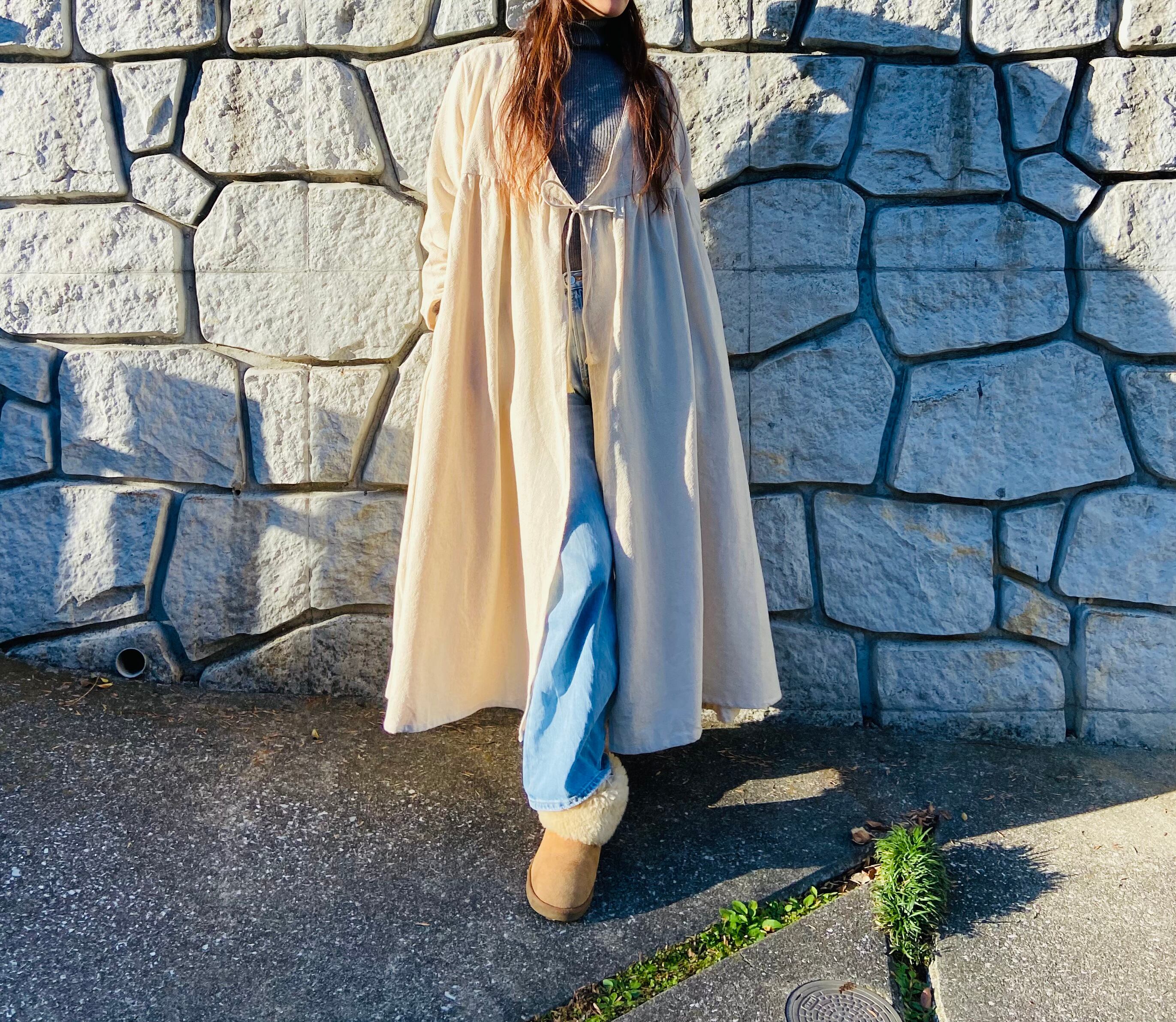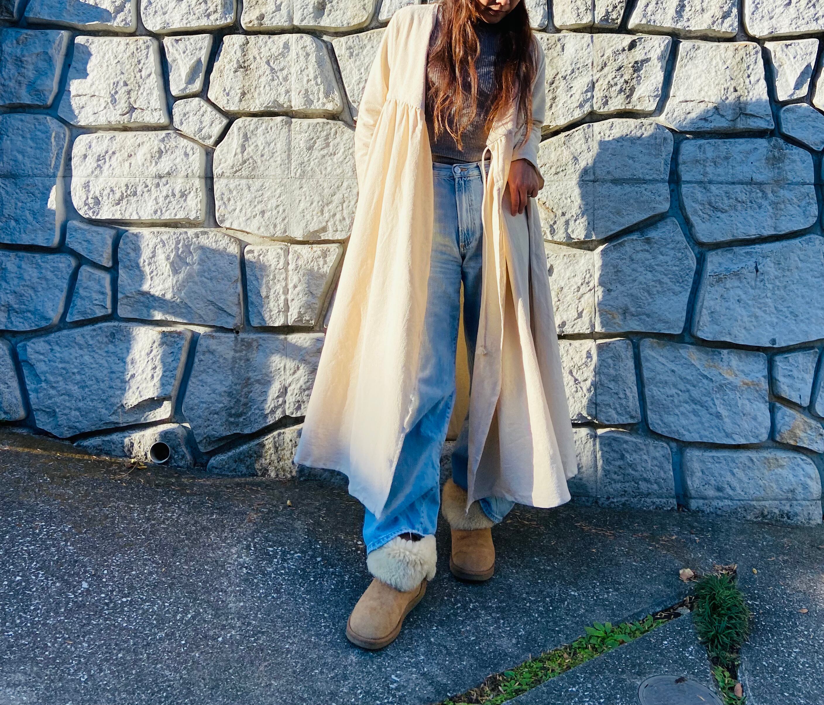 春夏は1枚でワンピースとして、秋冬は中にタートルネックやインナーと合わせてデニムなど合わせてガウンとして、いろいろなスタイリングが出来ます。