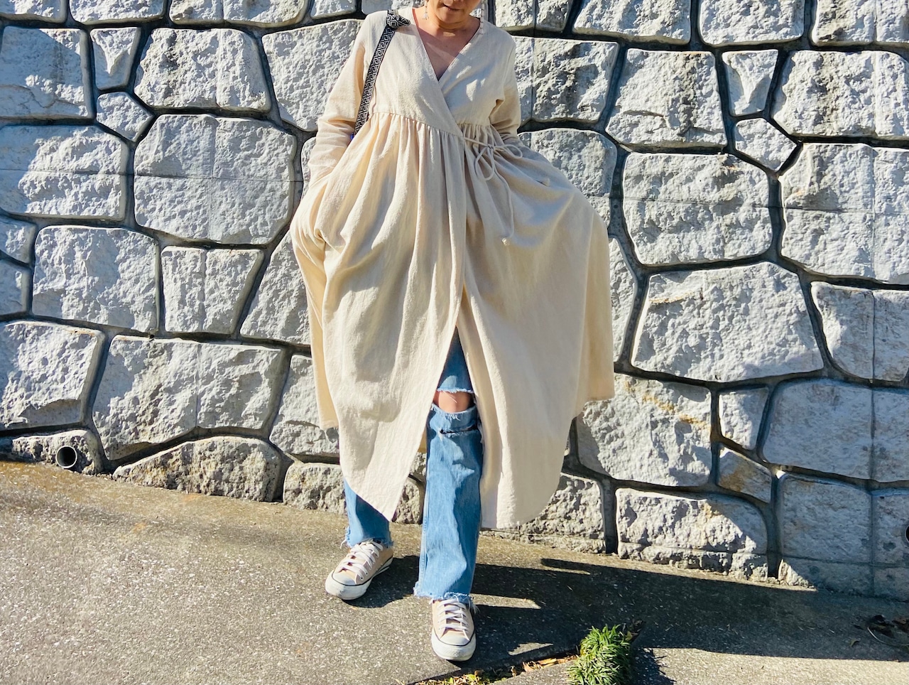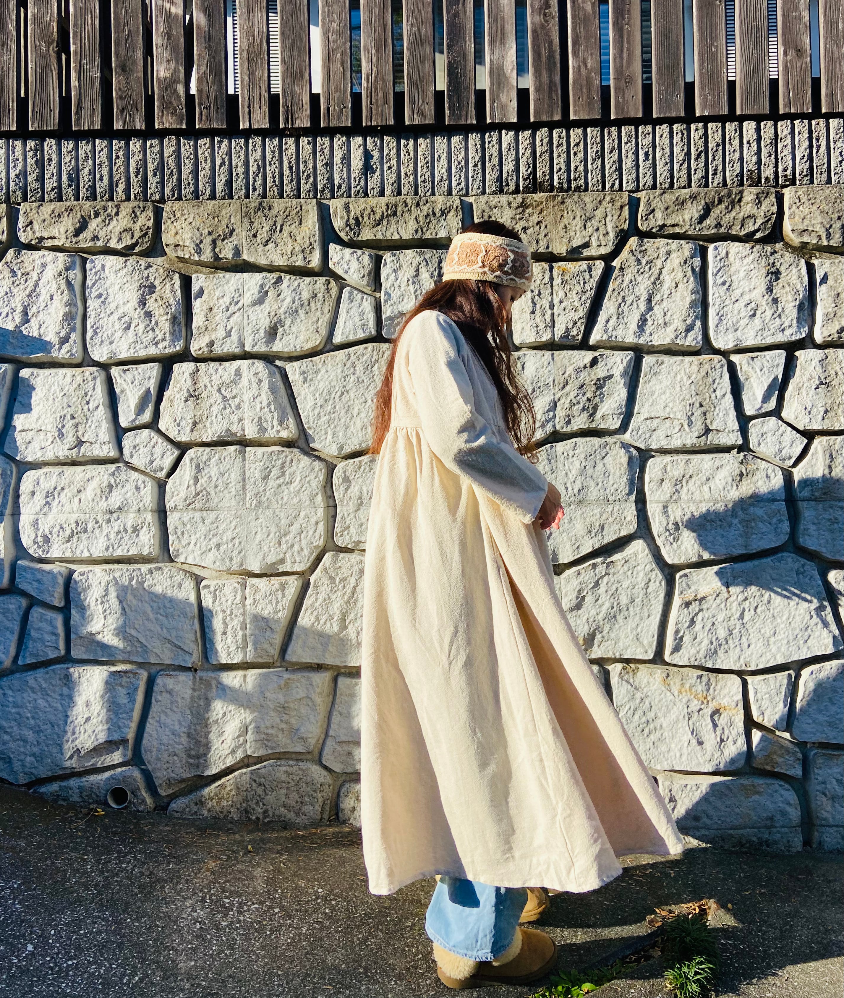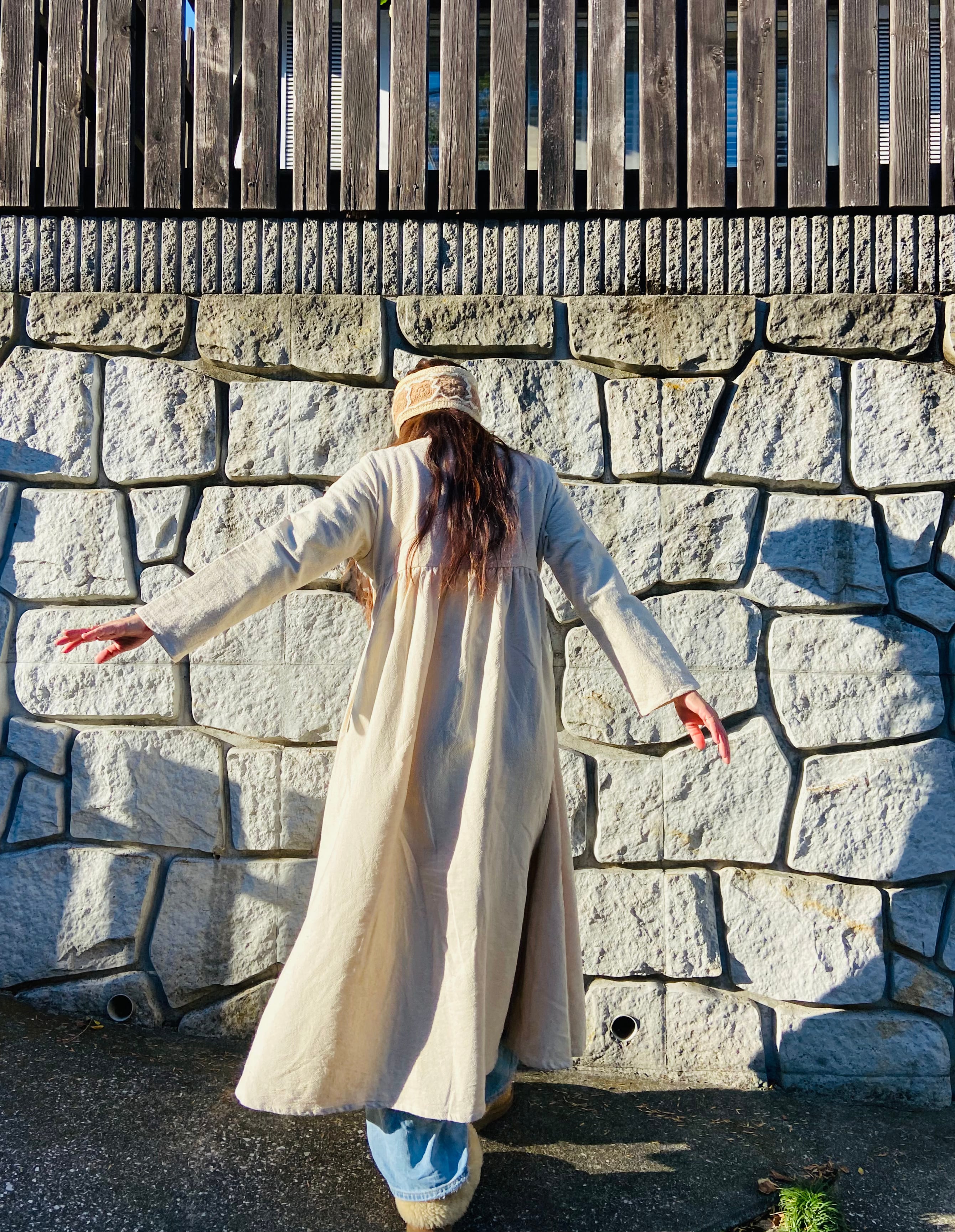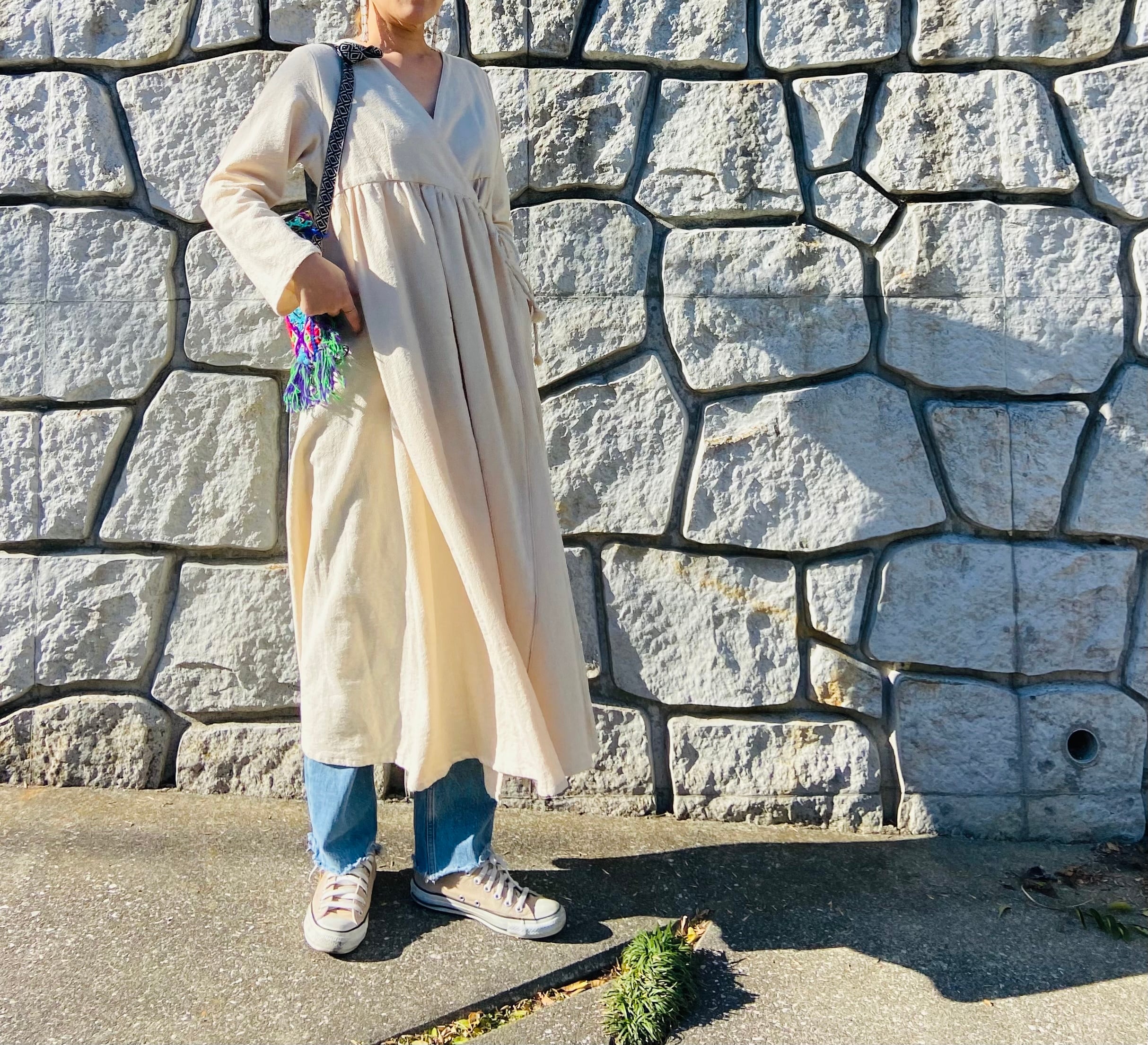 春夏は1枚でワンピースとして、秋冬は中にタートルネックやインナーと合わせてデニムなど合わせてガウンとして、いろいろなスタイリングが出来ます。