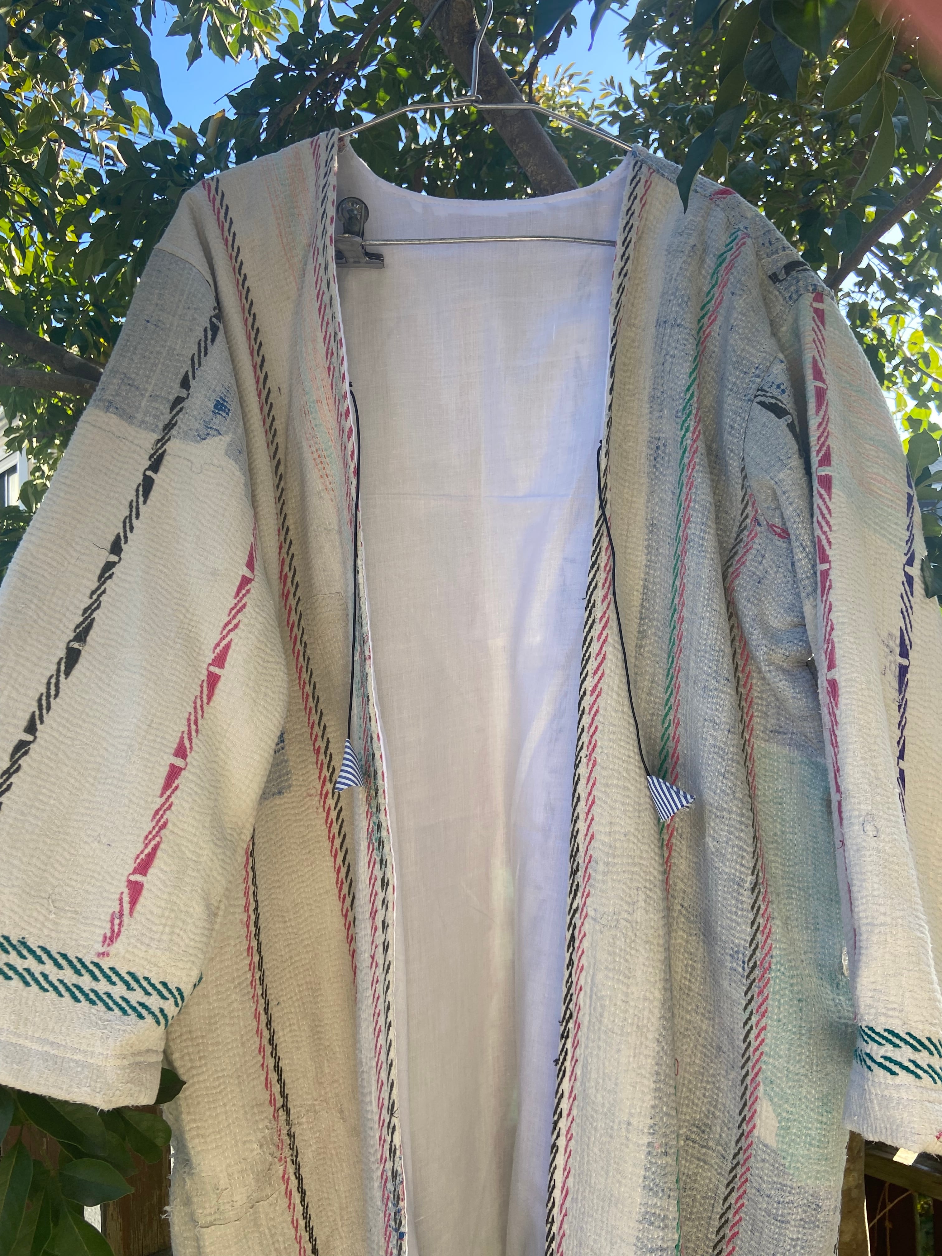 カンタ刺繍とは古くからインドとバングラデシュの境界あたりの伝統ある手刺繍の刺し子のことで、女性が使わなくなったサリー生地を何枚も重ねて1針1針刺し子をしていき頑丈になった生地である。